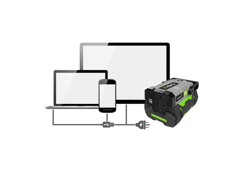 Der EGO Power+ PAD1500E kann einen 42-Zoll-Fernseher bis zu zehn Stunden lang betreiben, 27 Mobiltelefone oder 5 Laptops aufladen und liefert Ihnen so die nötige Energie, wenn Sie sie brauchen (Angaben basierend auf einem 7,5Ah Akku).